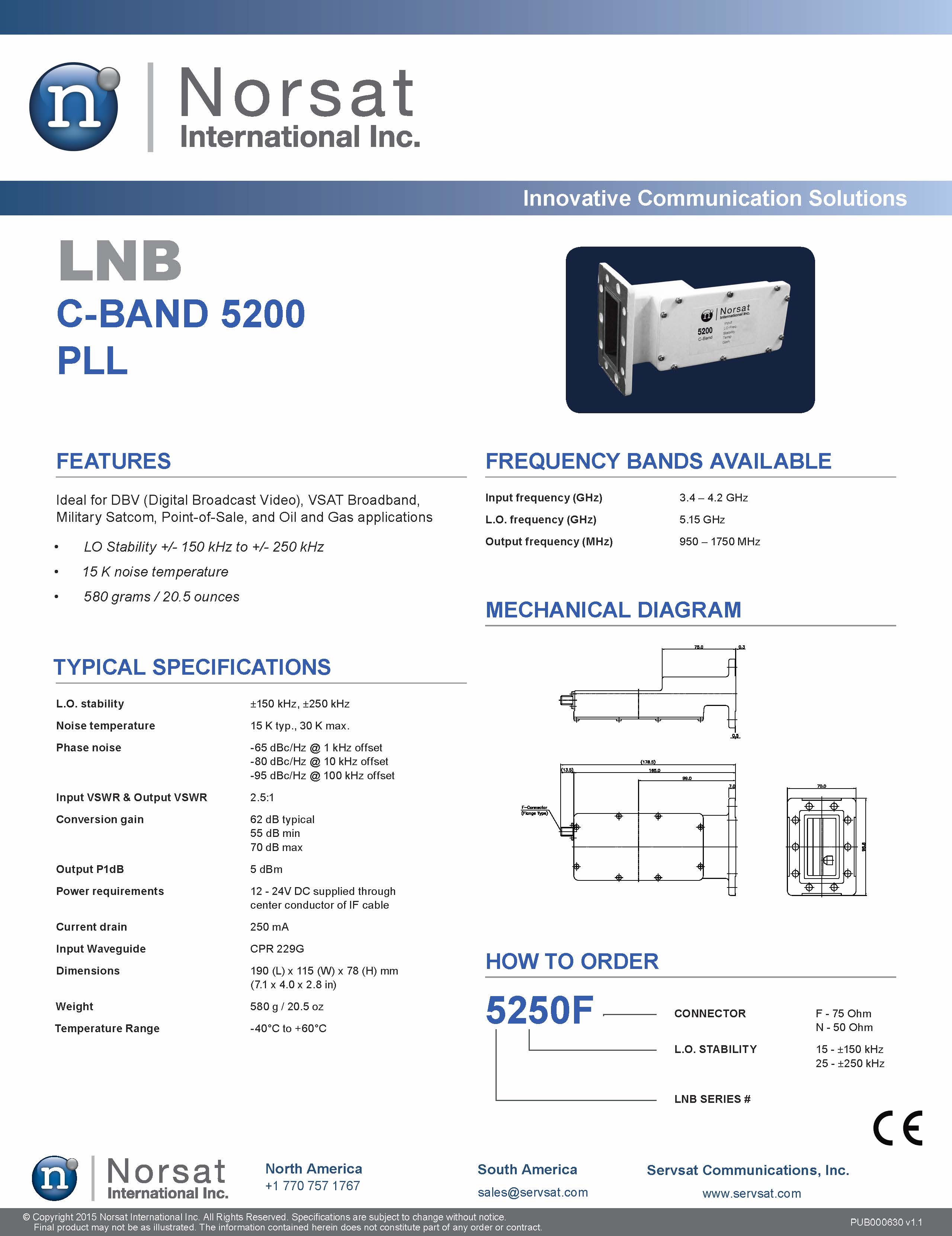 C Band PLL Model 5250, L.O Stability +/- 250Khz, Noise Temperature 15 K typ., 30 K max., Freq. 3.4~4.2GHz