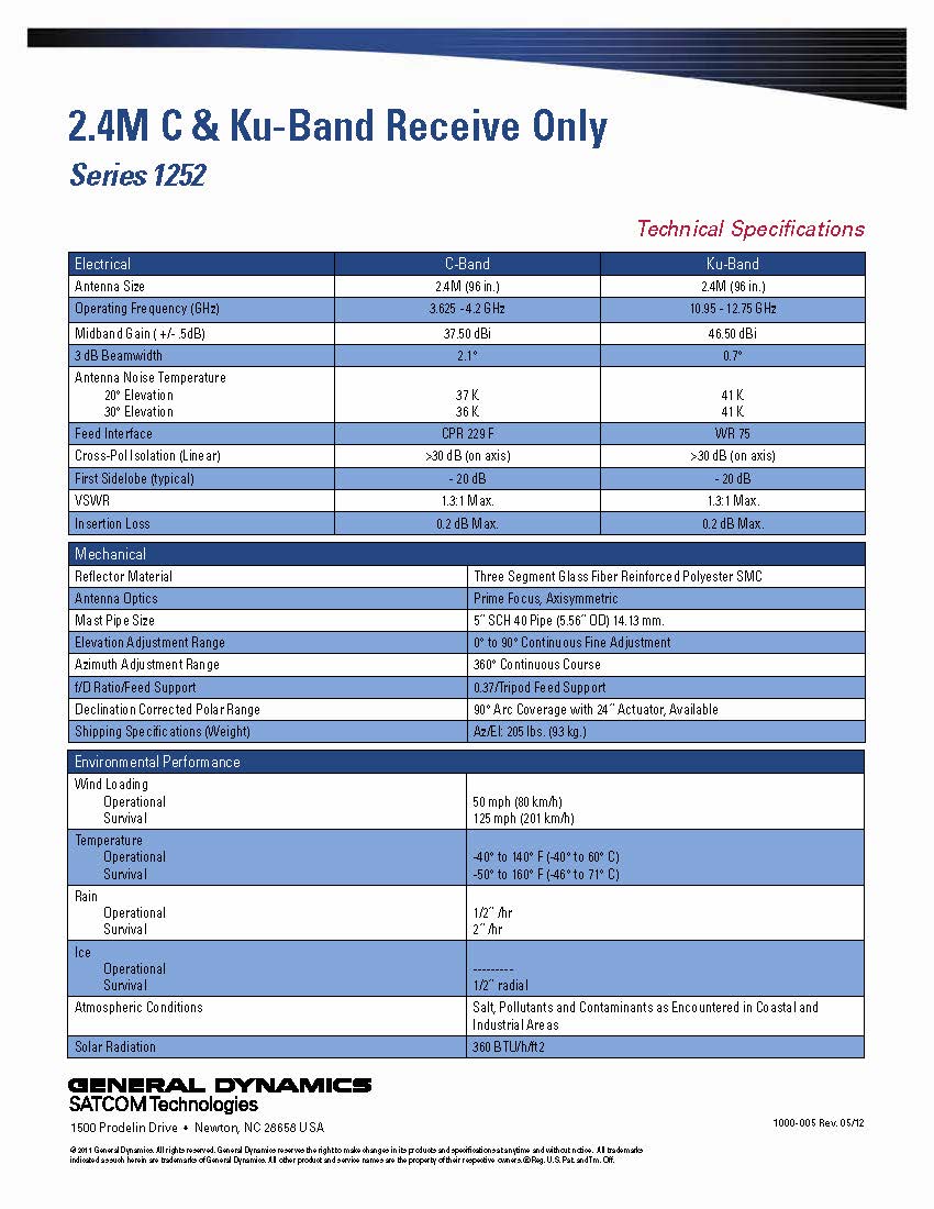 2.4 Meter Prime Focus Receive-Only Antenna. SMC 3 Panel Reflector. Feed Rx-Only is not included and it is quoted separatelly (Linear or Circular). Precision Compression Molded SMC Reflector. Fixed Az/El Galvanized Mount. Model Series 1252. Frequency Rx:3.625~4.2 GHz.