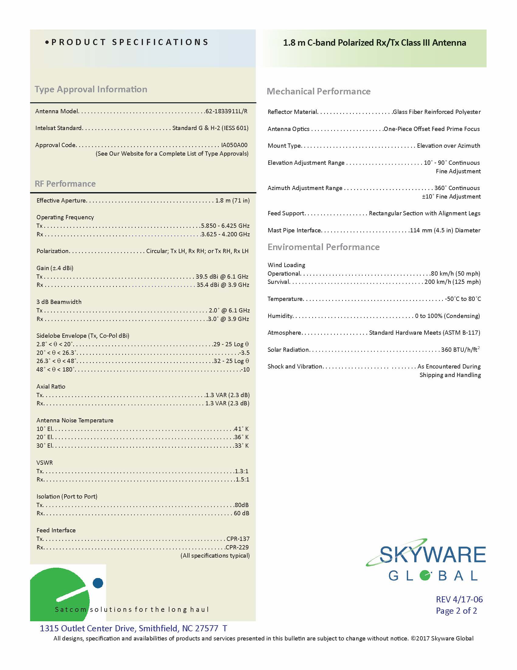 1.8m VSAT antenna , one-Piece Offset Feed Prime Focus. Circular Polarization. Tx Frequency: 5.850 - 6.425 GHz. Rx Frequency: 3.625 -4.20 GHz. Glass Fiber Reinforced Reflector. Class III: Accommodates 11 kg / 25 lb. for BUC and LNB.