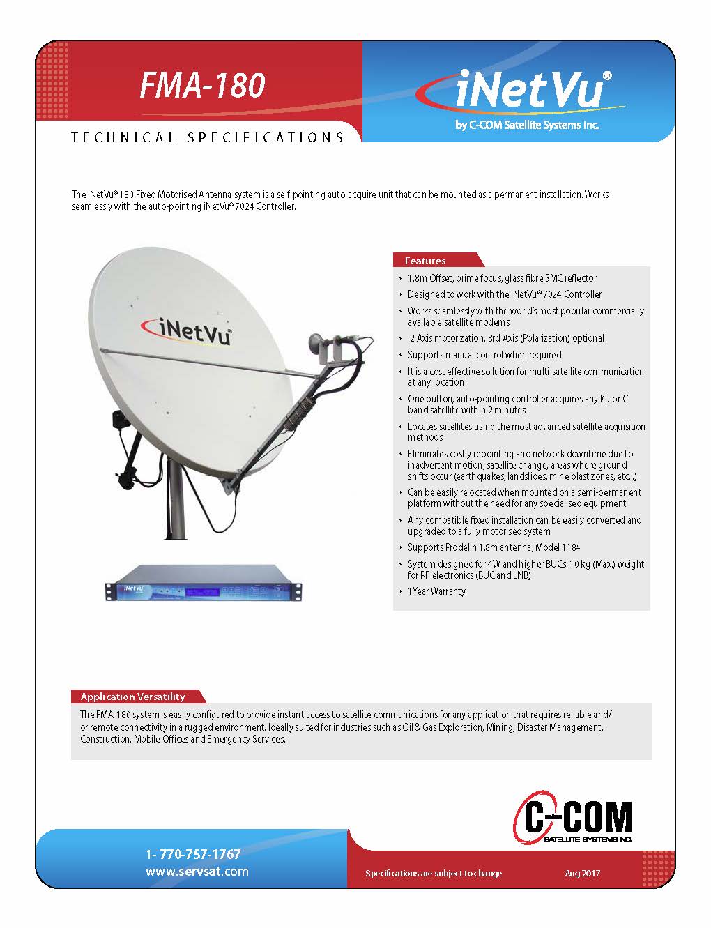 The iNetVu® 180 Fixed Motorised Antenna system is a self-pointing auto-acquire unit that can be mounted either as a permanent installation or on a portable fixed base. The antenna works seamlessly with the iNetVu® 7024C Controller.
