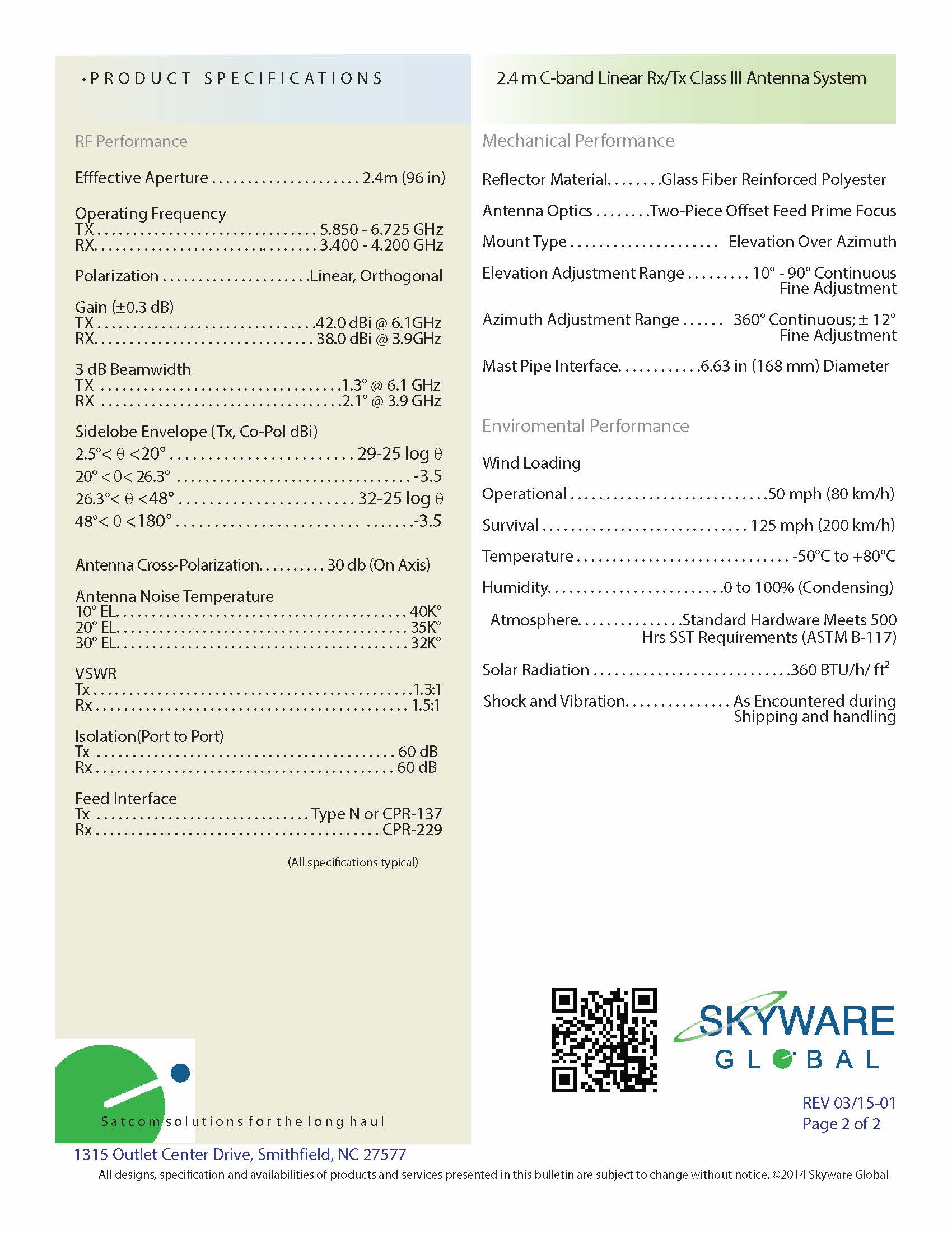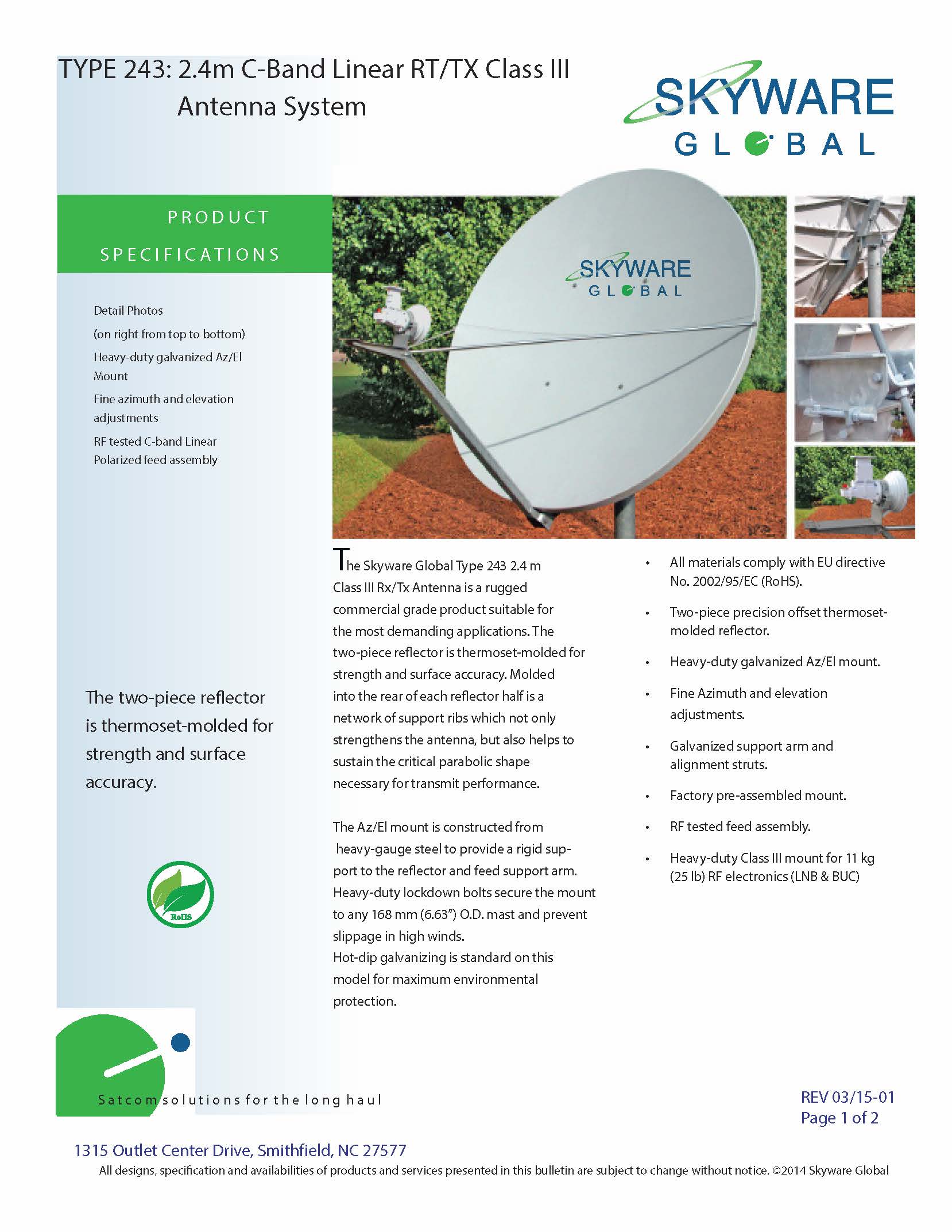 2.4m VSAT antenna , one-Piece Offset Feed Prime Focus. Tx Frequency: 5.850 - 6.725 GHz. Rx Frequency: 3.40 -4.20 GHz. Glass Fiber Reinforced Reflector. Class III: Accommodates 11 kg / 25 lb. for BUC and LNB.