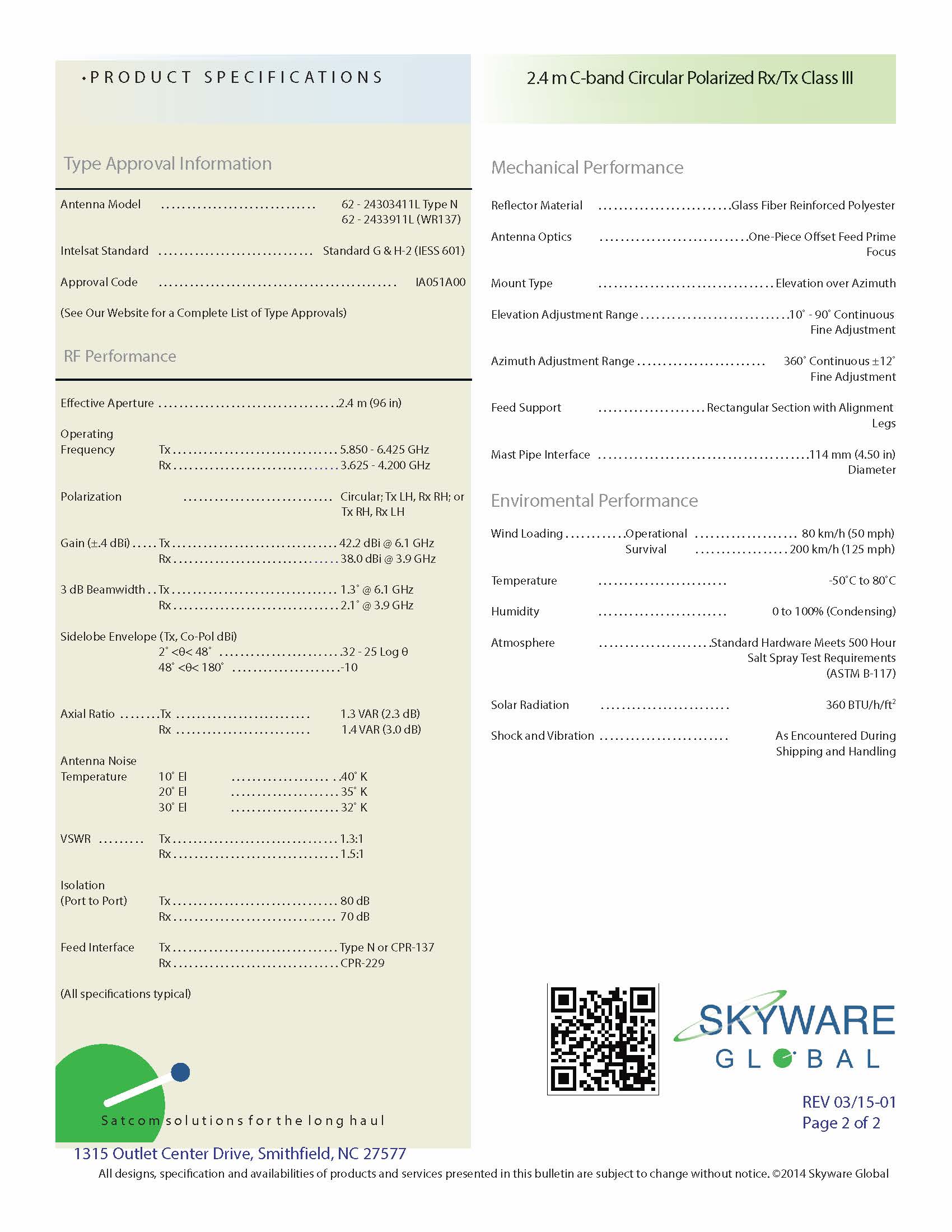 2.4m VSAT antenna , one-Piece Offset Feed Prime Focus. Circular Polarization. Tx Frequency: 5.850 - 6.425 GHz. Rx Frequency: 3.625 -4.20 GHz. Glass Fiber Reinforced Reflector. Class III: Accommodates 11 kg / 25 lb. for BUC and LNB.