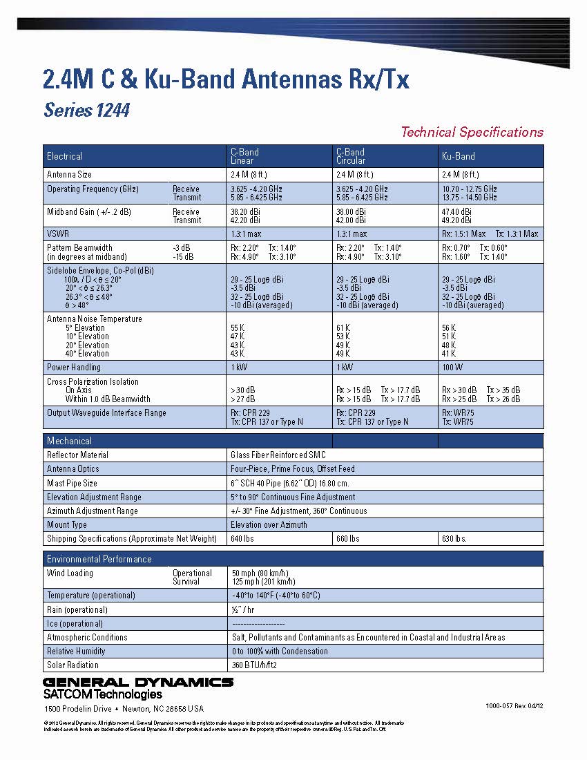 VSAT Antenna 2.4m . C Band 2 Port Tx Rx Circular Pol. Feed Assembly. Frequency: Rx 3.625 - 4.20 GHz, Tx 5.85 - 6.425 GHz. Tier 3 Feed Support. Precision Compression 4 Panel Molded Reflector. Intelsat Approved.