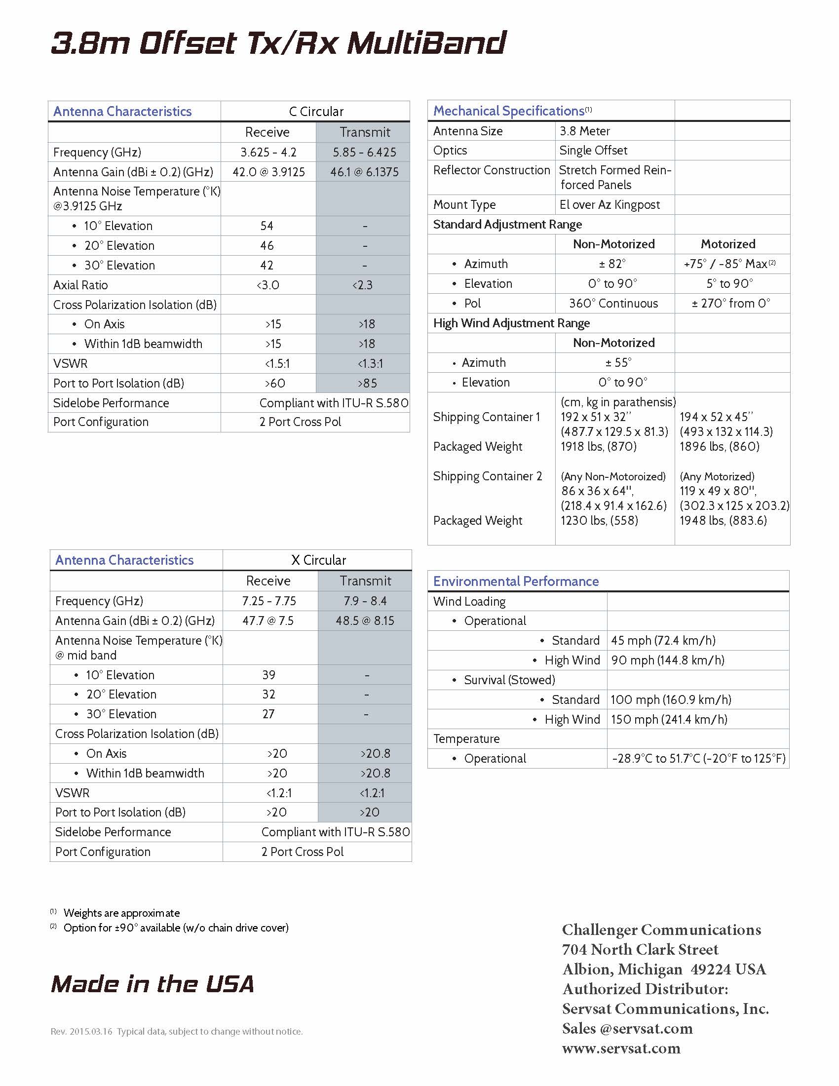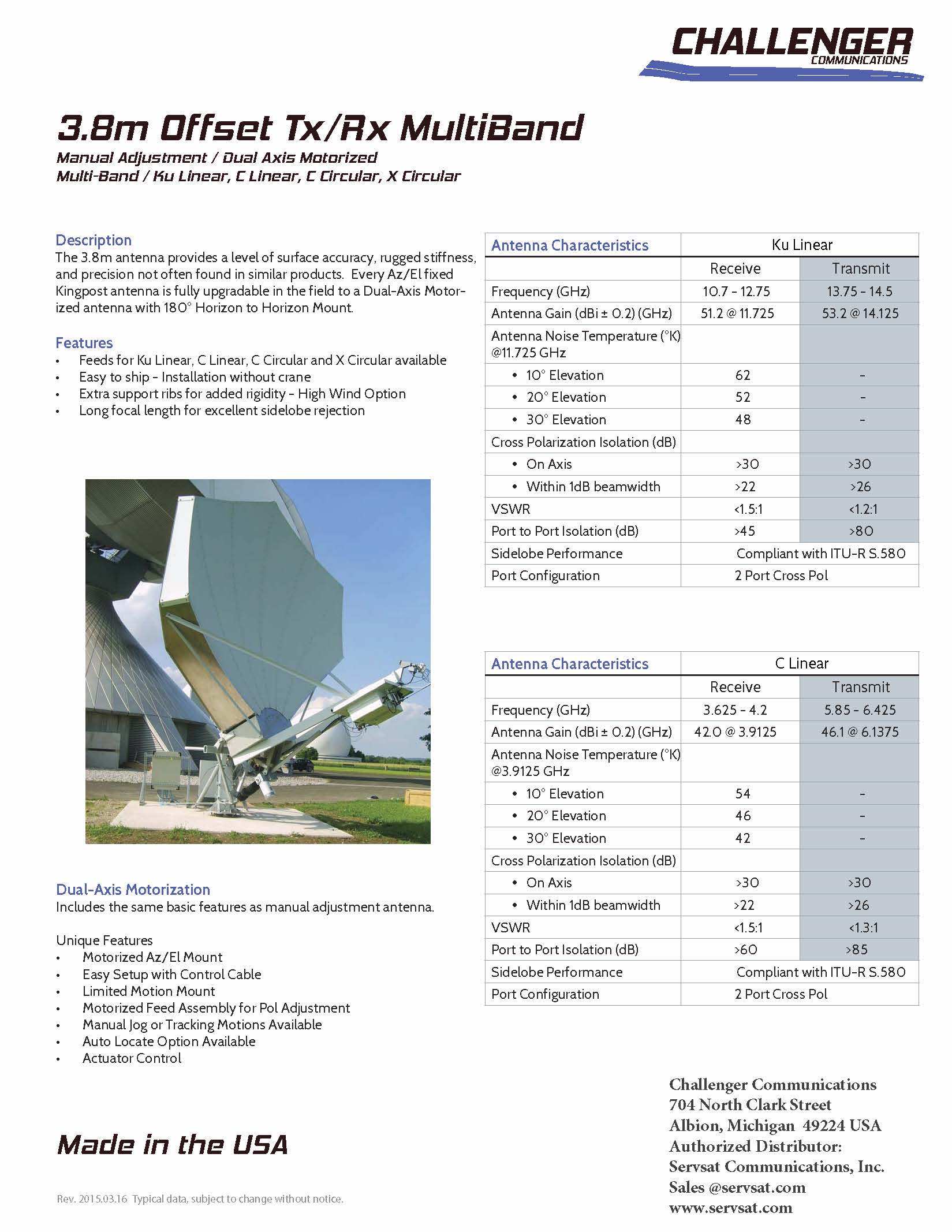 The 3.8m antenna provides a level of surface accuracy, rugged stiffness, and precision not often found in similar products. Every Az/El fixed Kingpost antenna is fully upgradable in the field to a Dual-Axis Motorized antenna with 180° Horizon to Horizon Mount. Easy to ship. Installation without crane. Az/El fixed Kingpost and Dual Axis Motorized. Reflector Construction of Stretch Formed Reinforced Panels.