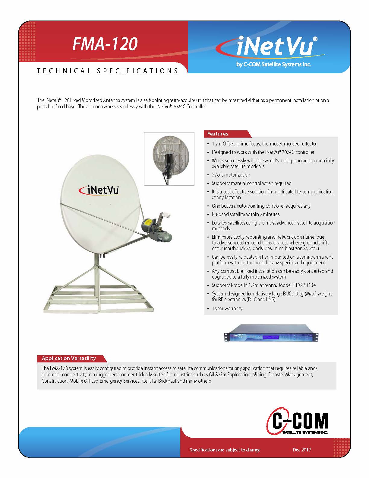 The iNetVu® 120 Fixed Motorised Antenna system is a self-pointing auto-acquire unit that can be mounted either as a permanent installation or on a portable fixed base. The antenna works seamlessly with the iNetVu® 7024C Controller.