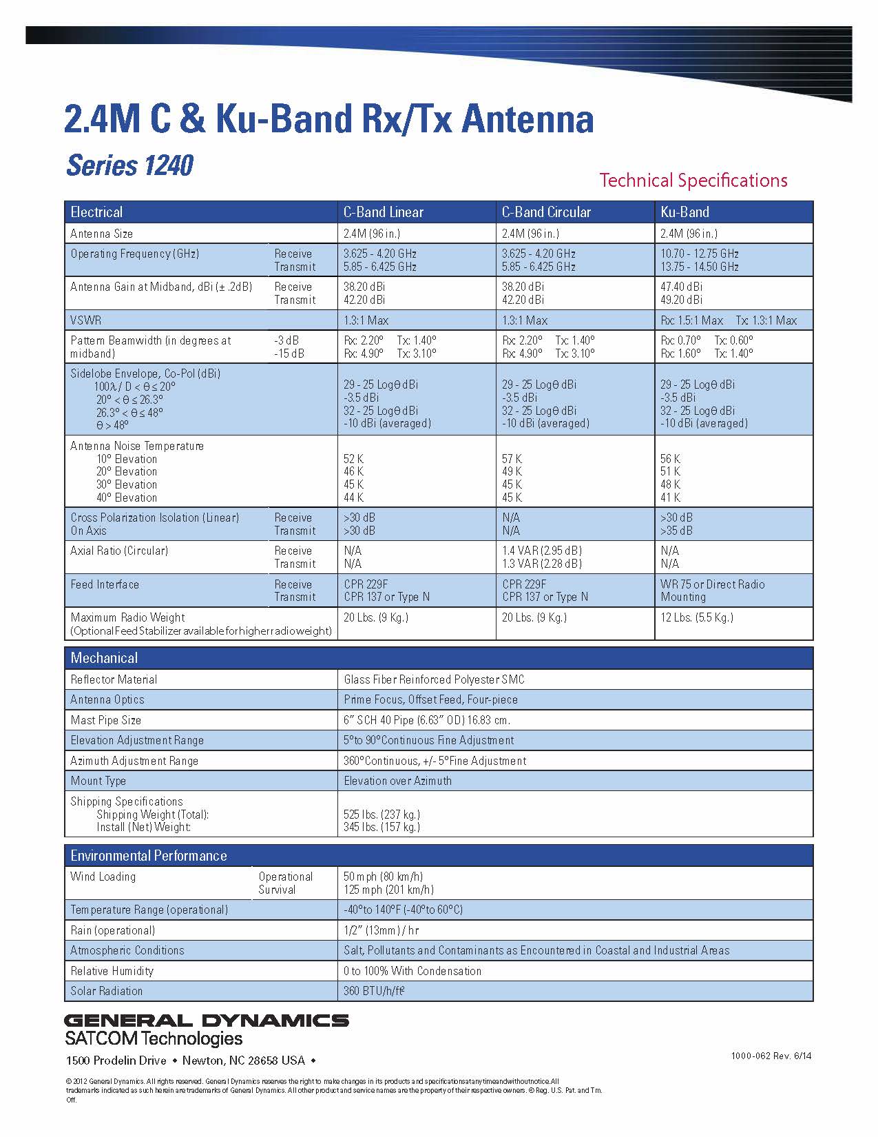 VSAT Antenna. Ku Band 2 Port Tx Rx Cross Pol Feed Assembly. 2.4m Meter Transmit Receive Antenna. Tier 3 Feed Support. Precision Compression 4 Panel Molded Reflector.