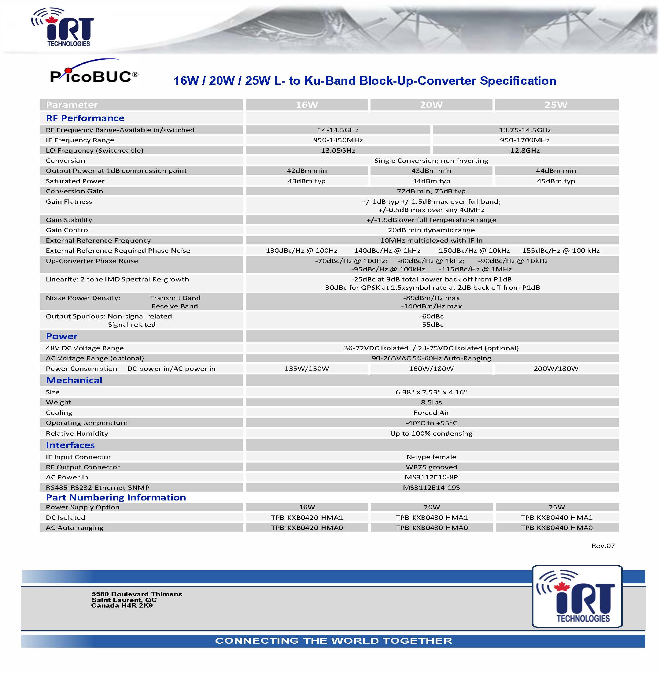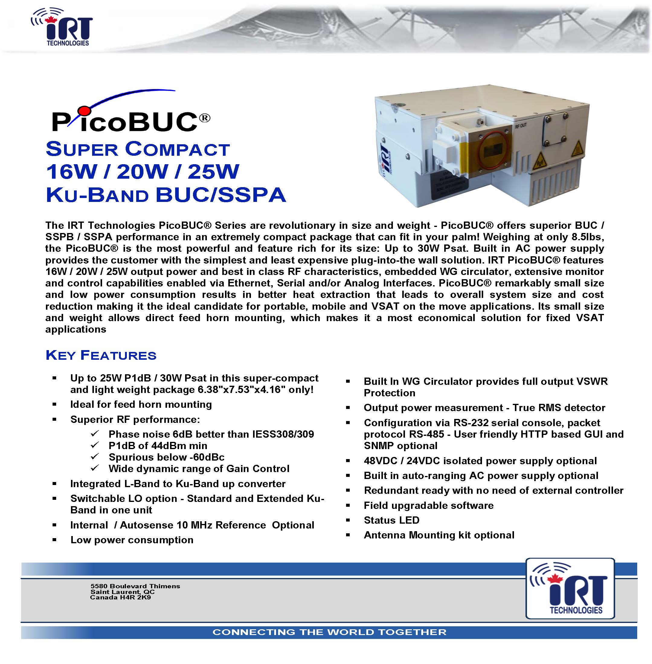 BUCs IRT banda Ku series PicoBUC. BUCs de alta densidad de potencia 16W / 20W /25W. Banda Ku tecnología Gan (BUC SSPA) . La banda de frecuencia del RF puede ser cambiado: 14-14.5 GHz (STD. Ku-Band), 13.75-14.5 GHz (ext. banda Ku). L.O.: 13,05 GHz/12.8 GHz. Obtenga el numero de parte en la ficha técnica.